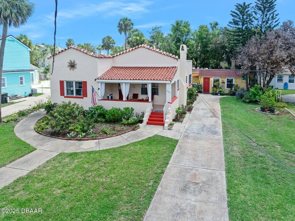 HISTORIC DAYTONA BEACHSIDE... This captivating, one of a kind, 1918 Spanish-inspired residence offers a unique blend of historic charm and modern updates. The interior features arched openings, high ceilings, intricate woodwork, and a decorative fireplace with a mosaic-tiled hearth. The mid-century kitchen, boasting ample light and storage, complements a spacious formal dining room equipped with built-in shelving and storage. Beyond the inviting living room, you will find a generously sized guest bedroom, the sun-drenched ''sunroom'', a convenient hallway lavatory, a sizable primary bedroom suite, and a versatile den/office/laundry room with direct access to the backyard and outdoor shower. The property has been meticulously maintained with annual inspections, including a recent exterior painting, updated electrical in 2022, a new AC and water heater in 2021, and a new roof in 2017. Additionally, a spacious one-bedroom, one-bathroom apartment or guesthouse, ideal for income... cont.. production, features newer AC units and is currently occupied by a long-term tenant who wishes to remain. This desirable location, with NO HOA, offers convenient beach access just 4 minutes away, near the Hard Rock, the Seabreeze entertainment corridor, lots of restaurants and pubs, the Bandshell, boardwalk, fishing pier, and the World's Most Famous Beach. All information recorded in the MLS is intended to be accurate but cannot be guaranteed.