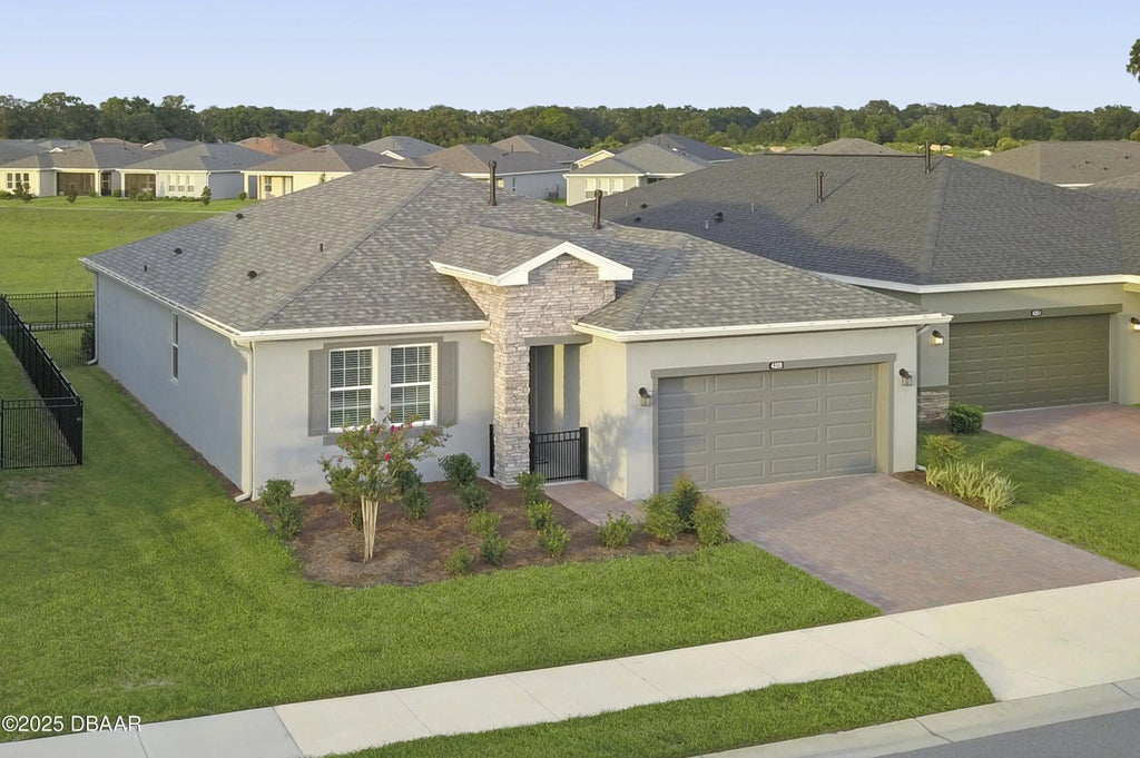 Discover this beautiful 2-bedroom, 2-bathroom home with an additional flex space well suited for office or overflow guest space. This home is nestled on a 25,000 premium lot with a fenced-in yard and screened lanai. With rear neighbors far across a lovely ravine, and no sight/or sound lines with next-door neighbors, this home provides exceptional privacy. Step inside to find a warm and welcoming entry corridor with upgraded tile flooring throughout the main living areas. As well as attractive remote fans strategically placed in every room. The kitchen is perfect for entertaining, featuring a large and long island which comfortably seats 5-6 guests. Tons of beautiful dark smokey cabinetry, crisp white backsplash and coordinated granite countertops. Gas stove with built in oven air fryer, stainless steel appliances and large pantry closet complete this exceptional kitchen. The kitchen effortlessly opens into the great room/dining with large sliders to your lanai, providing beautiful backyard views.The open-concept floor plan features split bedrooms for added privacy. The primary bedroom is generously sized, with a large walk-in closet and an ensuite bath that boasts dual vanities and expansive walk-in shower with custom decorative safety bars. The guest bedroom feels very private and peaceful and is immediately adjacent to the guest bathroom and also includes decorative safety rails in the shower/tub combo. All of the post-closing necessities totaling $30,000, have already been done for you, including but not limited to gutters, lanai screening, fans in all rooms, water softener, high end washer and dryer, safety bars and towel bars in bathrooms, fencing, 10 year termite bond with attic service, and whole-house circuit breaker. This home is a perfect blend of luxury and functionality, ready to welcome you home. Don't miss this opportunity to live in the beautiful Ocala Preserve!